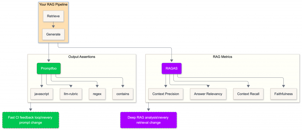 If you’re building a RAG system, you need both. Use Promptfoo for fast iteration on prompts and output quality. Use RAGAS to understand whether your retrieval pipeline is actually pulling the right context and whether your model is faithful to it.