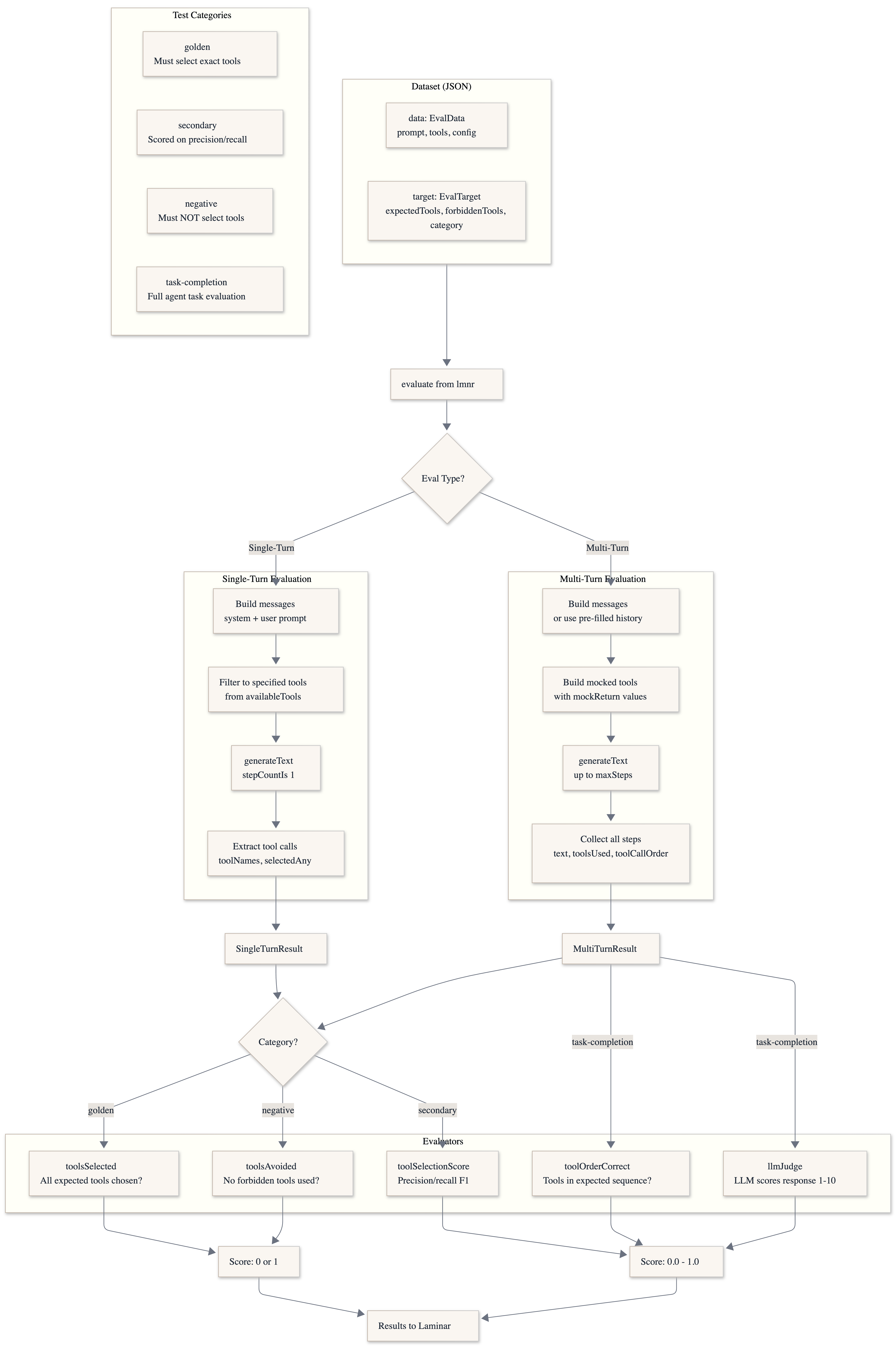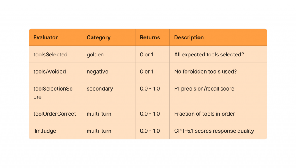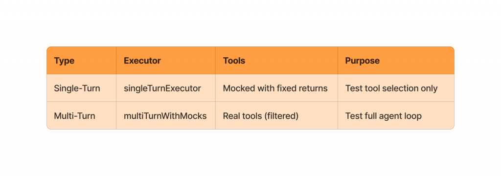 But why do you mock tools instead of letting them run? Mocking tools in single-turn evaluation isolate the model’s reasoning and decision-making from external system variability. Real tools can be slow, flaky, rate-limited, or return changing data, which introduces noise and makes results hard to reproduce. By using mock tools with deterministic responses, you can consistently evaluate whether the model knows when and how to use a tool, without conflating model quality with infrastructure issues. This keeps single-turn evaluations focused on model behavior, not the reliability of downstream systems.