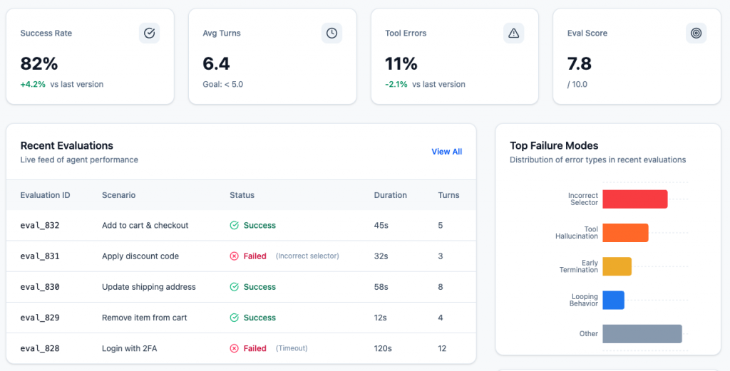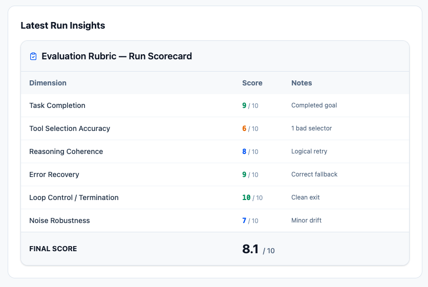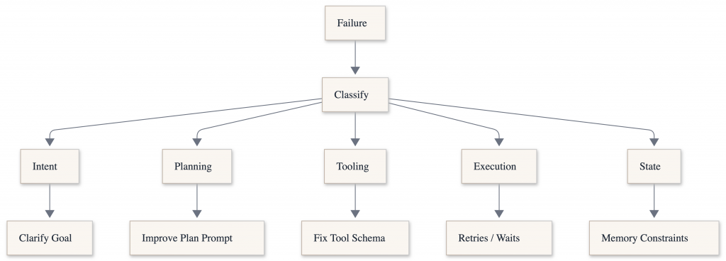 Failure classification is the process of categorizing why an AI system failed, rather than just noting that it failed. Instead of a single “wrong answer” label, failures are categorized into types, including reasoning errors, tool misuse, hallucinations, state loss, instruction misinterpretation, or poor recovery behavior. This is especially important for task-based agents, where an early mistake can have a cascading effect across multiple steps. Clear failure classification turns evaluations into actionable signals, helping teams understand what to fix and track whether changes actually improve agent behavior over time.