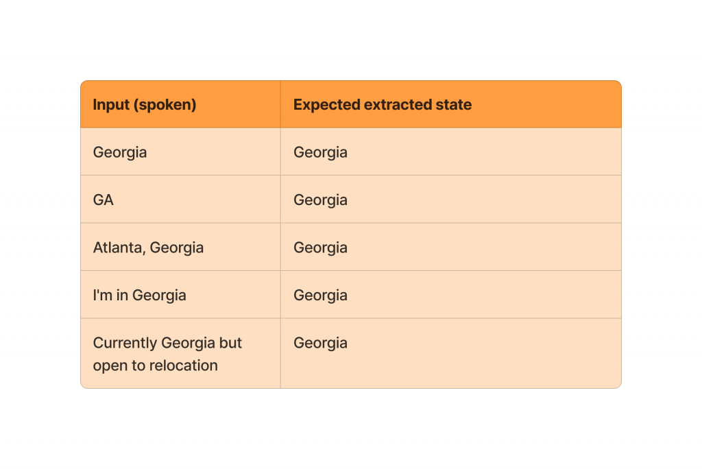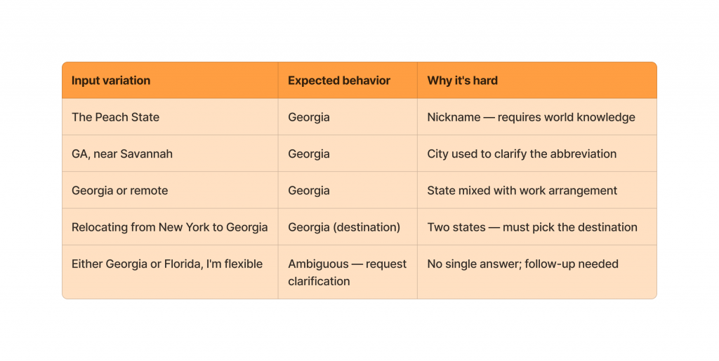 The last two cases are particularly important. If the system blindly extracts the first state it sees, “Relocating from New York to Georgia” produces the wrong answer. If it forces a single value from “Georgia or Florida,” it silently drops valid ambiguity. Both are real failure modes worth testing explicitly.