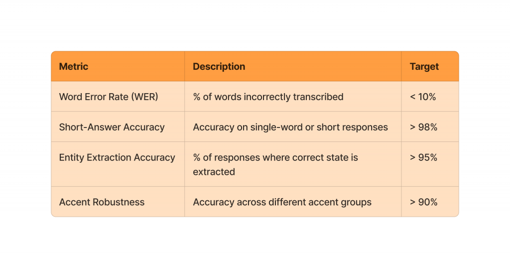 Short answers like state names, numbers, and yes/no are actually some of the hardest cases for speech recognition systems. Clean studio audio can achieve WER under 5%, but real interview conditions — browser microphones, background noise, varied accents — typically push that to 8–12%.