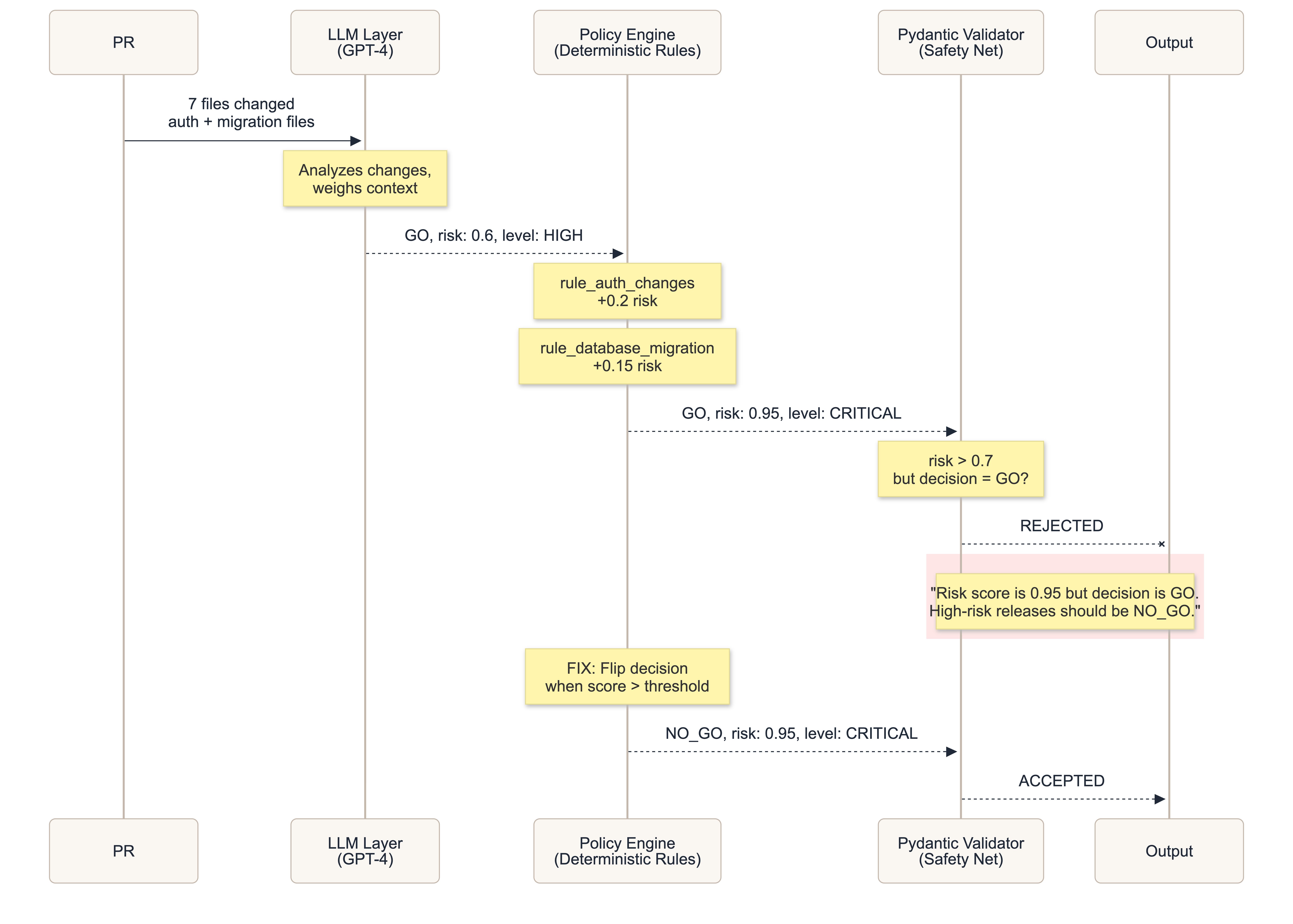 No single layer was wrong in isolation. The LLM’s original assessment was defensible. The policy engine’s risk adjustments were correct. The problem only emerged when their outputs were combined — and the validation layer was the one that caught it.